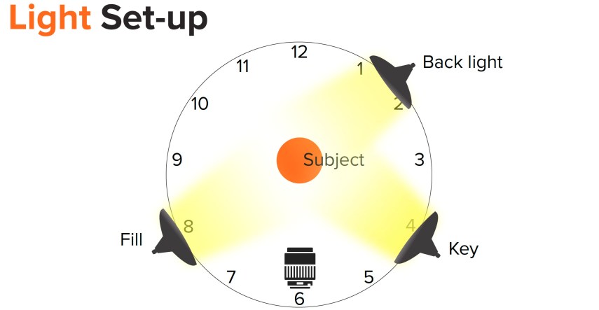 最常見的燈光設(shè)置稱為3點(diǎn)照明。這種配置包括一個(gè)聚光燈,一個(gè)補(bǔ)光燈和一個(gè)也可稱為hairlight的背光。