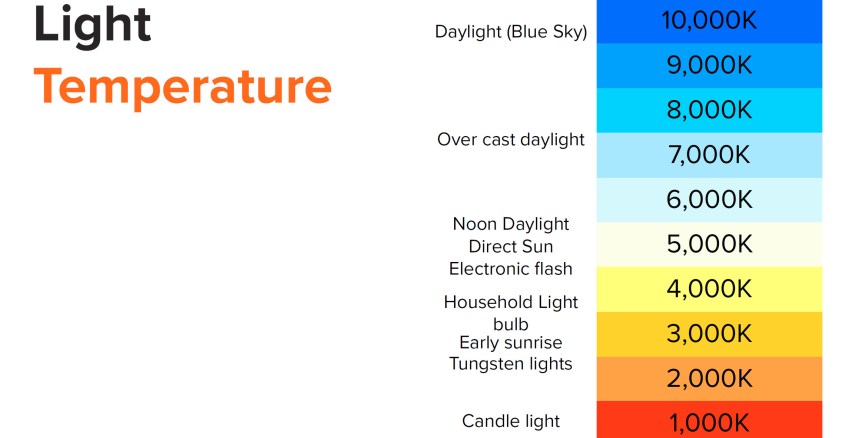 考慮一下醫(yī)生辦公室的外觀(冷熒光燈)與舒適的起居室設(shè)置(暖鎢燈)相比。這個(gè)概念稱為色溫,可以用開爾文量表來測量(見下圖)。